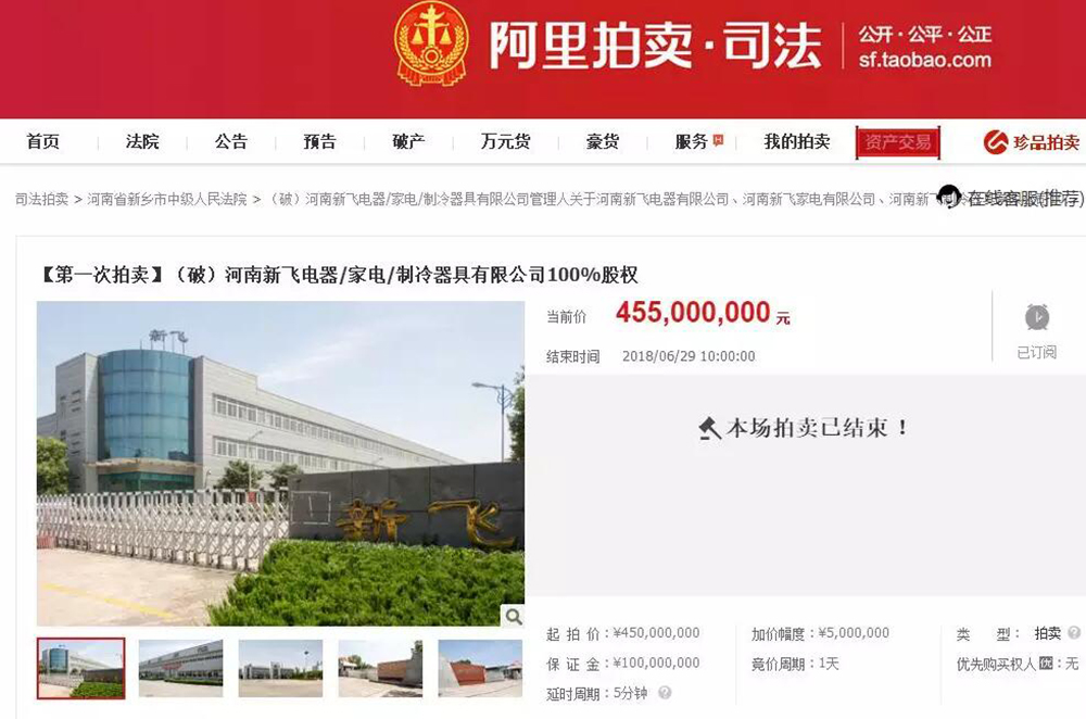 ▲6月28日~29日,新飛股權拍賣在阿里拍賣進行,邁出了重整計劃執行工作中最關鍵一步。在此次拍賣收官前5分鐘,安徽康佳電器科技有限公司經二次出價,以4.55億元勝出,成為新飛適格重整投資人。