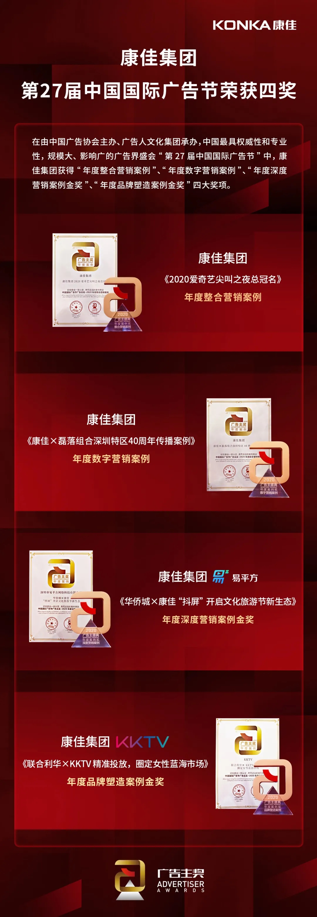 作為在我國品牌廣告領域中專業性強、規模浩大、影響深遠的廣告獎,本次國際廣告節集結了過去一年里廣告行業中大量的品牌優質營銷案例,同時邀請了各大品牌優秀的代表人物,大會表彰了過去一年中對中國廣告行業做出突出貢獻的企業和品牌。此次2020廣告主獎吸引了百余家媒體推薦和上千個企業參評,康佳集團成功攬獲四項殊榮,更是有力地詮釋其完整且精準的品牌營銷及推廣能力。