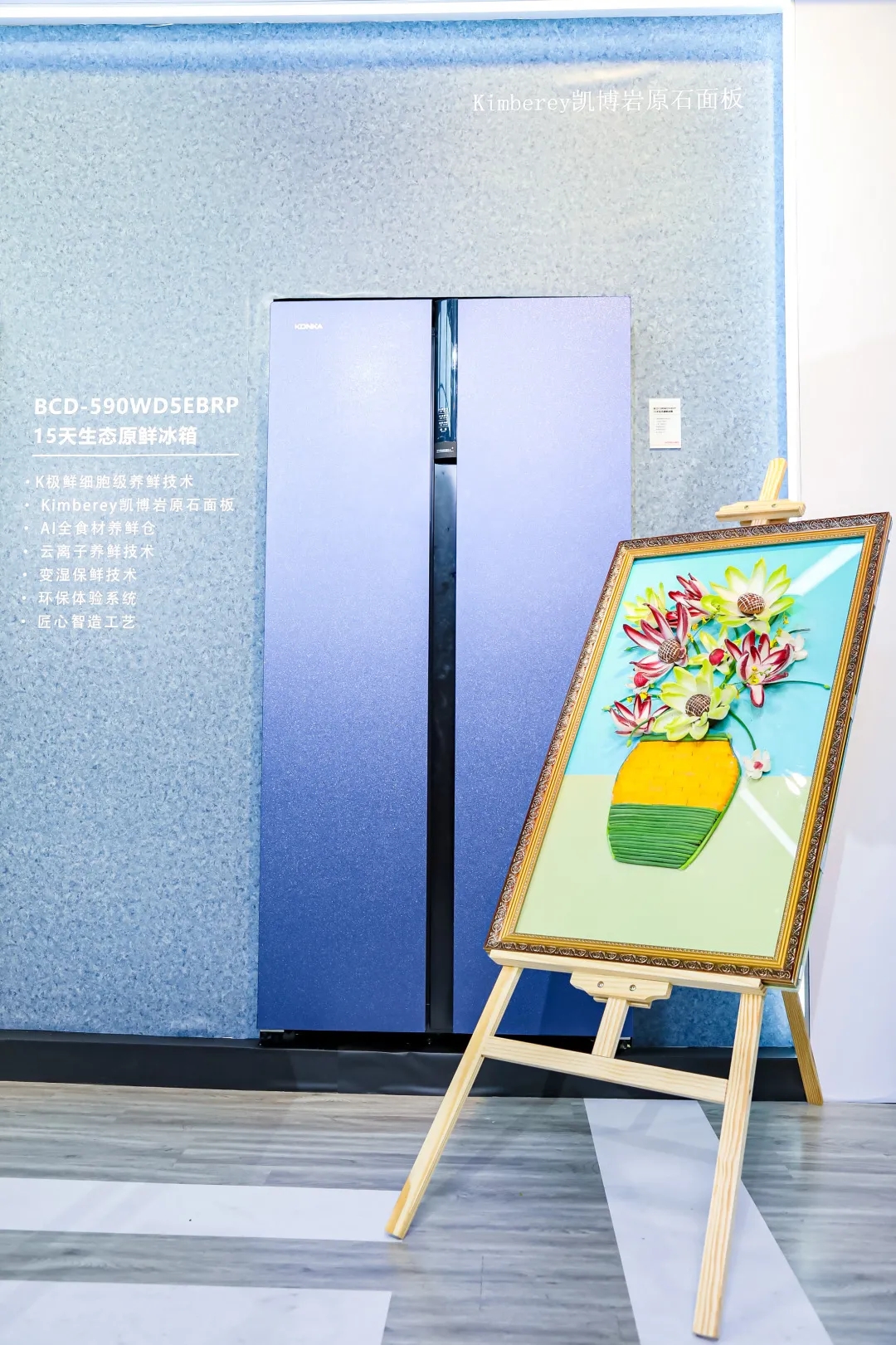展會現場,康佳15天生態原鮮冰箱BCD-590WD5EBRP全新亮相,該款產品突破了傳統冰箱金屬與玻璃的取材,創新采用四層礦石融合而成的凱博巖原石面板,經過101道工序和2000°C高溫鍛造,鑄就雅致大氣的高端品質。