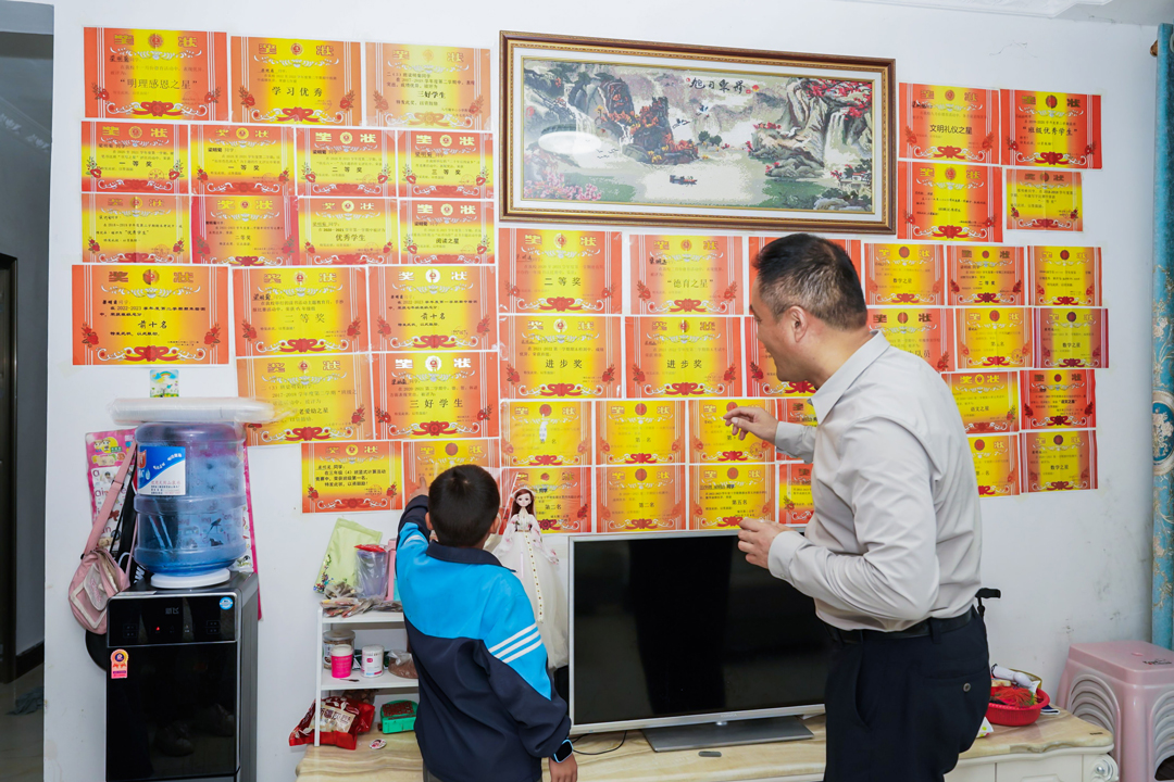 ? ? "叔叔!阿姨!我一定好好學(xué)習(xí),長大以后做一個對國家、對社會有用的人,以愛傳遞愛......"在移地搬遷小區(qū)脫貧戶家中,大家走訪看望了受到援助的三穗縣城關(guān)三小五年級學(xué)生劉某晨說。她在家中排行老二,爸爸在深圳打工,媽媽在家專職看管四個孩子,簡陋的房間十分整潔,面積略小的客廳墻上,貼著"五好學(xué)生""數(shù)學(xué)學(xué)科一等獎""文明禮儀之星"等21張獎狀。康佳集團(tuán)"山海之約"團(tuán)隊(duì)和職工代表詳細(xì)詢問孩子學(xué)習(xí)、家庭生活情況,劉某玥也匯報(bào)了上學(xué)期期末考試成績,并表達(dá)了對康佳叔叔、阿姨的感謝!